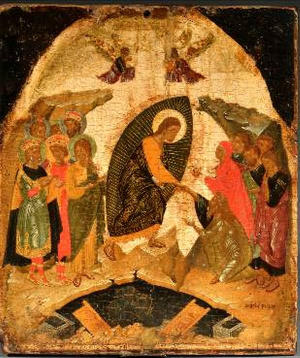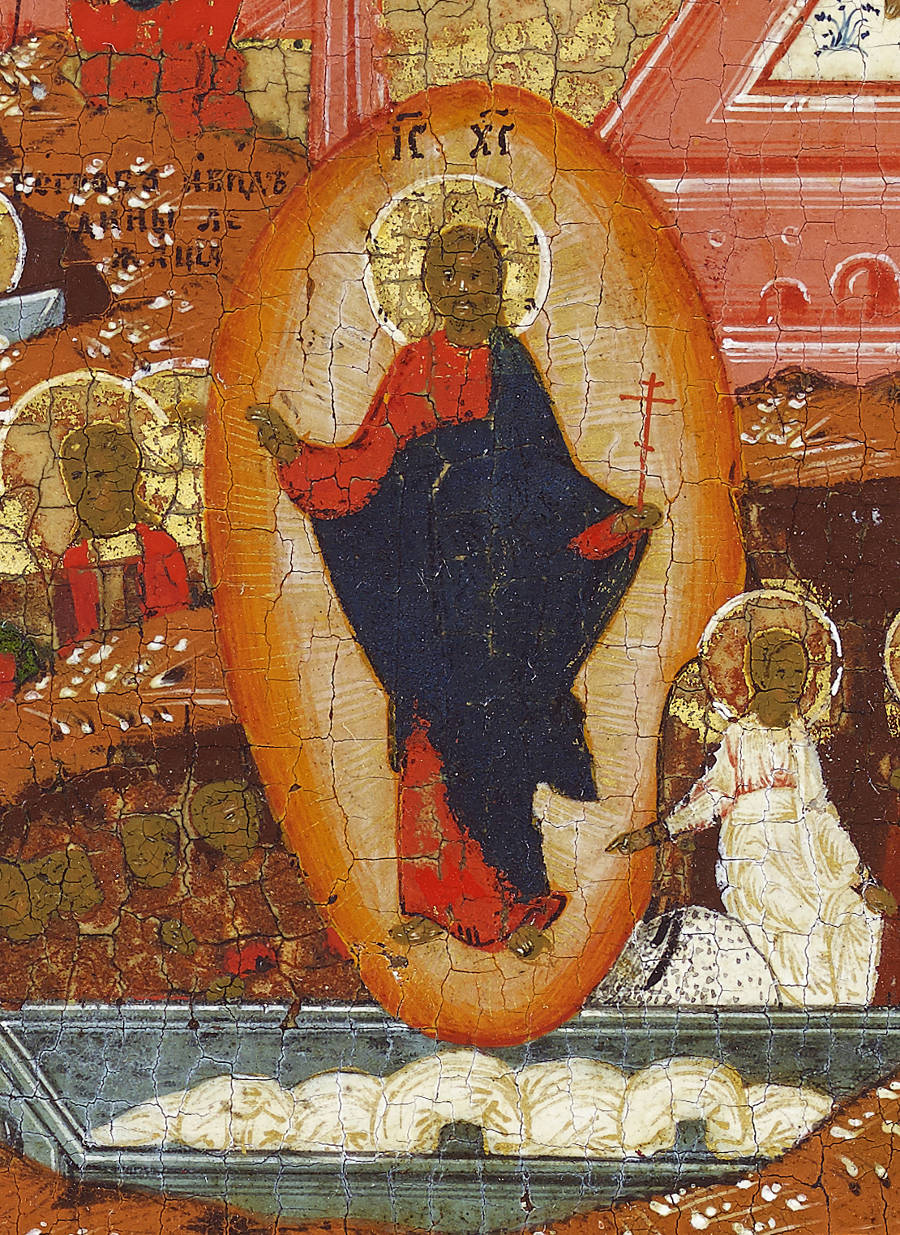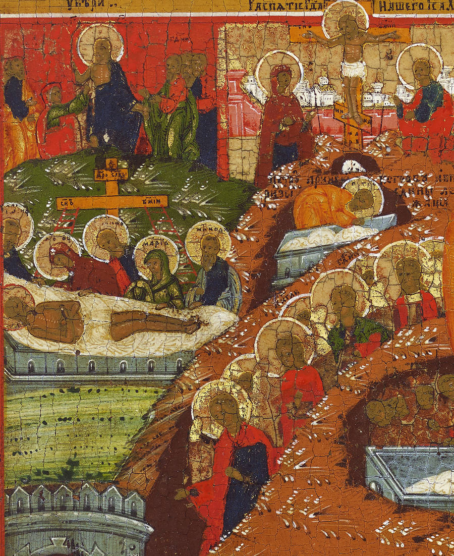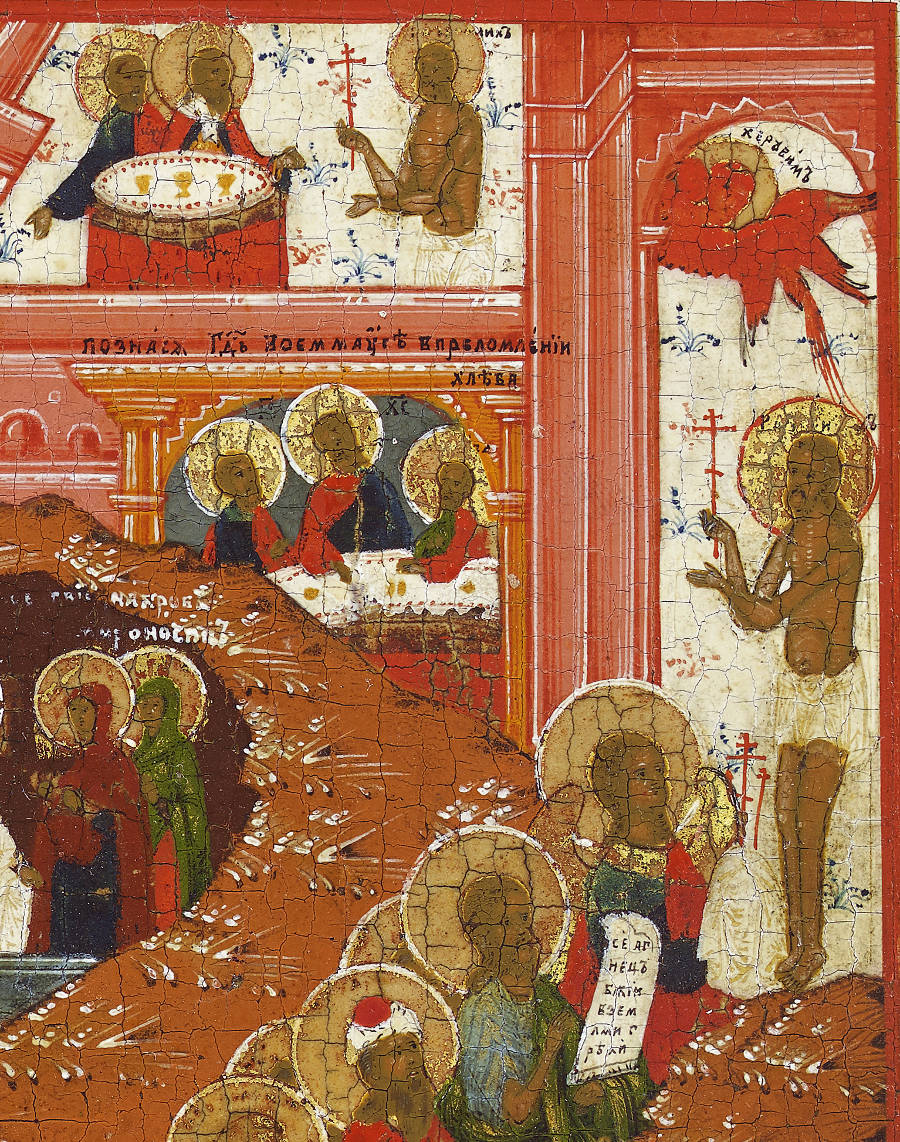 We see, in the lower-left corner, the Jaws of Hell from which Adam and Eve and all those who are saved emerge, including kings David and Solomon (identifiable by their crowns), St John the Baptist and other Old Testament figures. The procession winds upwards towards the Gates of Paradise (upper right corner). There, the Good Thief leads the procession and is preceded by a six-winged seraph. Within Paradise, depicted as a walled garden, we see that the Good Thief has entered and joins Enoch and Elijah (Old Testament prophets who had bodily entered Paradise). The Supper at Emmaus is below the wall, where the resurrected Christ reveals himself to two disciples. In the lower right, we see Christ calling the Apostles by Lake Galilee. In the upper left is the Crucifixion and, in the corner, the Doubting of Thomas. Just below is the Entombment and next to it the Shroud and the Empty Tomb with Joseph of Arimathea. The host of angels proceeds diagonally down below the Entombment, all looking towards the Archangel Michael, who beats the Devil. Christ is shown twice: Descending into Hell and Ascending into Heaven. At the centre, just below the Risen Christ, are the Myrrh-bearing women and the angel indicating the Empty Tomb.