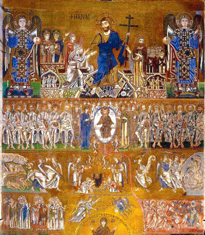 In later Russian icons such as the present example, the imagery is extended and elaborated. These changes are thought to have developed under the influence of western medieval art; particularly the wall paintings of the Last Judgment on the interior west wall of 12th century churches. The most magnificent example is at the Cathedral of Torcello, in the Venetian Lagoon (Fig. 3).