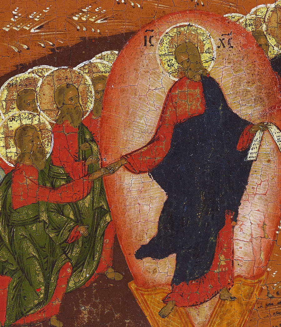 Even by Palekh standards the present example is unusually fine not only for its extraordinary artistic achievement but also as an expression of understanding and wisdom. Detail 1, for example, in the tender and meaningful looks and gestures of the three figures, expresses a comprehension of the event’s profound spirituality. The artist, without compromising the conventions of the form, has provided the living mystical content. The icon therefore is likely to come from the revival taking place in 19th century Russia referred to as ‘the Russian Religious Renaissance’ Paul Ladouceur writes of ‘the mystical theology of St Seraphim of Sarov [and] the revival of hesychastic spirituality’3.