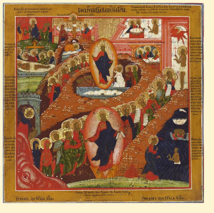 The event depicted in this icon, known in Russian as VOSKRESENIE I SHOSHESTVIE VO AD, in Greek as ANASTASIS and in Old English as the Harrowing of Hell, is the Orthodox Church’s greatest feast. It celebrates Easter, and shows Christ Descending into Hell to rescue Adam and Eve, and by implication all of humanity, from spiritual death; all this representing the general resurrection of humanity.